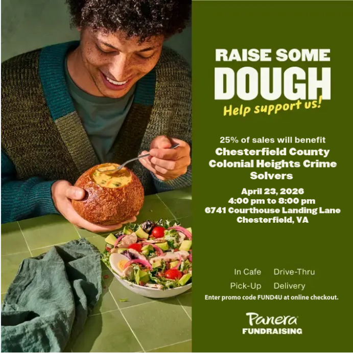 Panera Bread Fundraising is supporting the Chesterfield/Colonial Heights Crime Solvers Program on April 23, 2026. 25% of net sales will be donated to the program. To support this event use code FUND4U at panerabread.com, in the Panera App, or at the kiosk in-cafe.